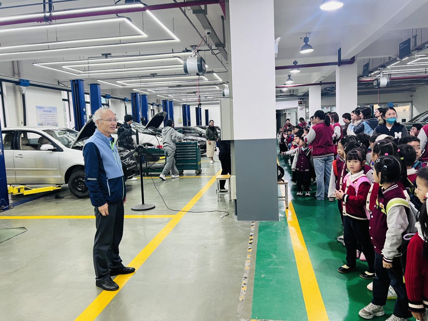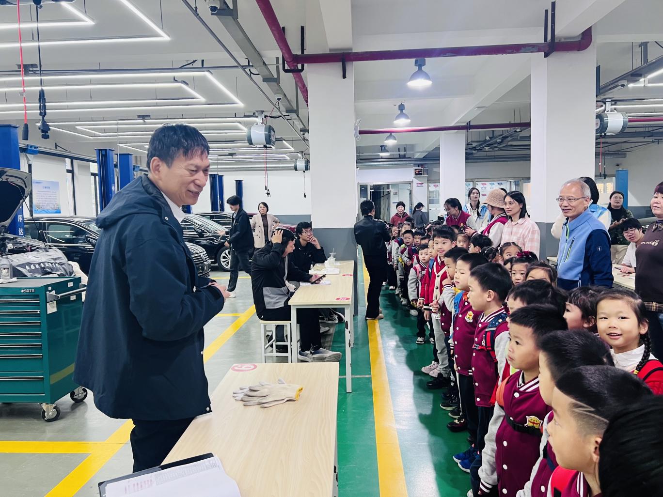 10月21日,保利幼儿园大班全体小朋友走进无锡职业技术大学汽车技术实训大厅,开启一场兼具趣味性与知识性的实践体验之旅,学校关工委秘书长周陆飞、全国技术技能大师李志军参与此次活动。