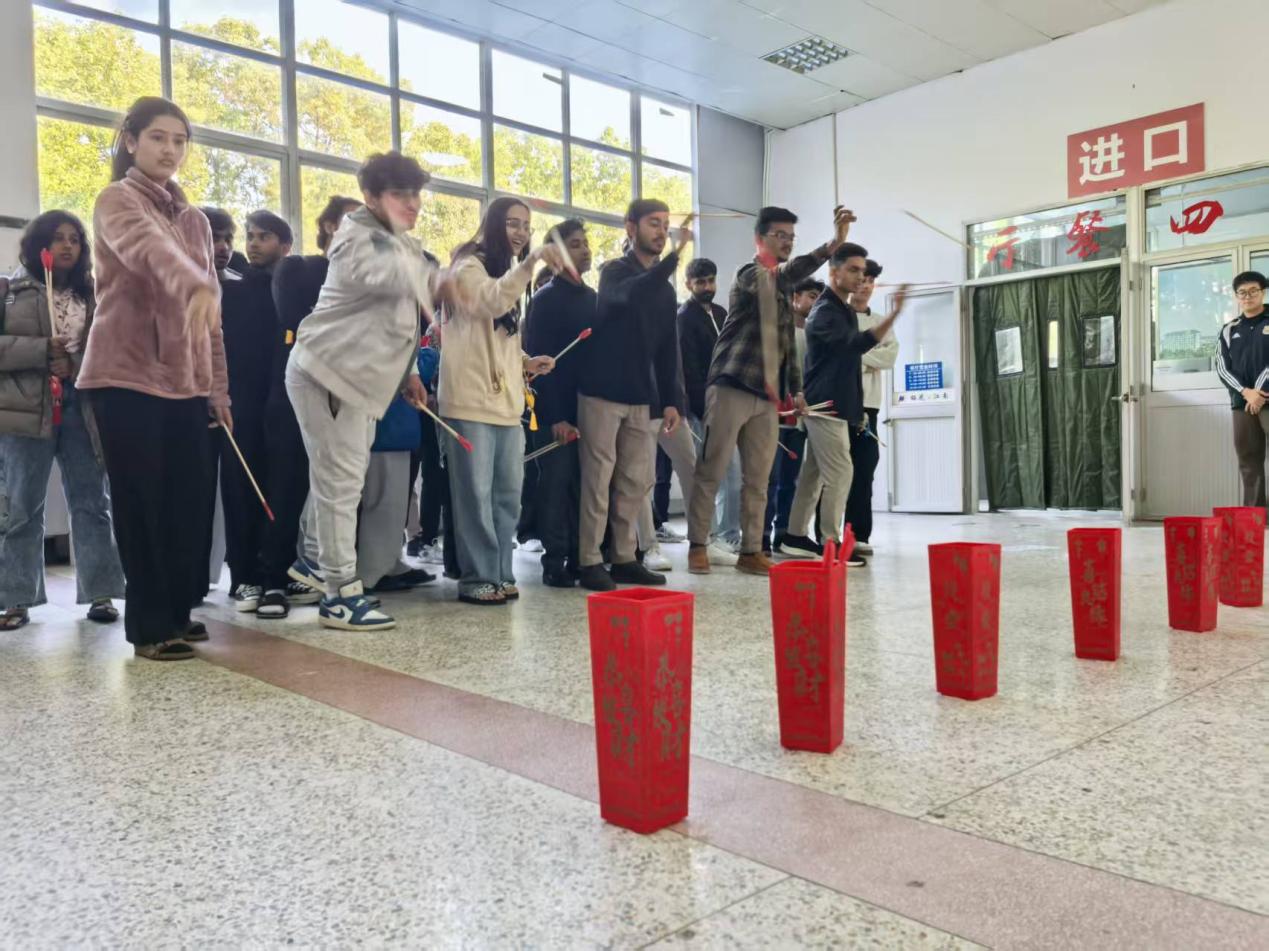 活动在“缘起·共话重阳”环节中拉开序幕。徐晴老师为同学们生动讲述重阳节的历史渊源与文化习俗,以亲切而生动的讲解,为中外学生打开了一扇了解中华传统文化的窗口。随后的“手作·共品秋韵”环节气氛温馨而活跃,在关工委老同志和老师们的悉心指导下,留学生们亲手制作重阳糕、冲泡菊花茶、缝制茱萸香囊,在协作互动中品味秋日意蕴,感受手艺传承中的敬老情谊。最后的“竞技·共承古礼”将现场气氛推向高潮,留学生们踊跃参与投壶比赛,在趣味体验中领会中华古代礼仪的风采与内涵。