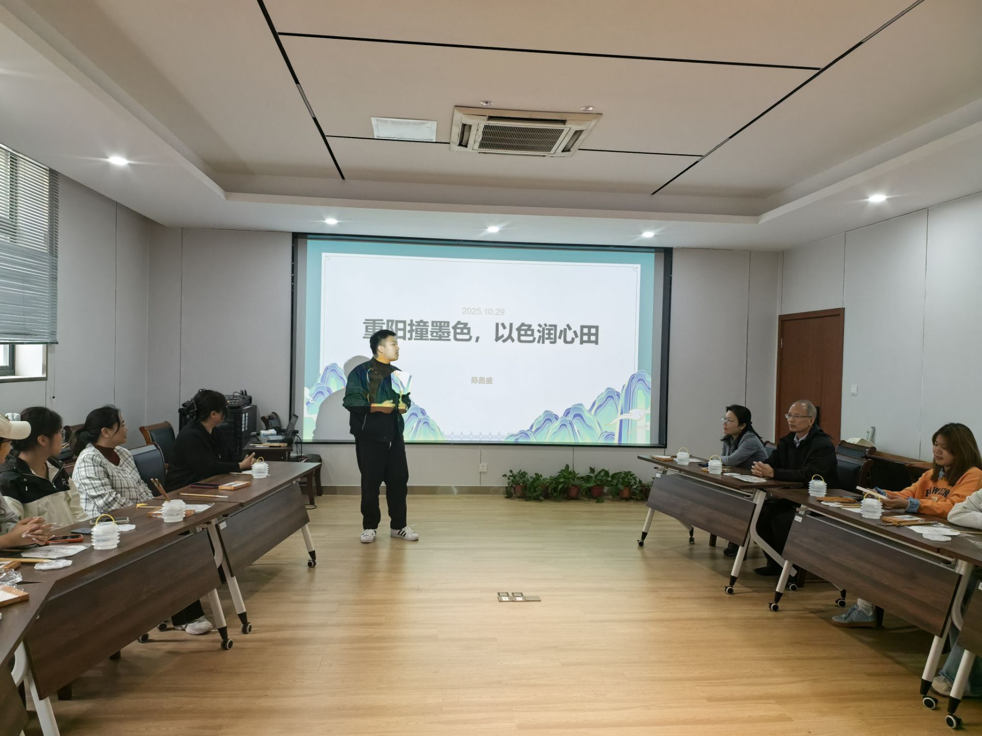 活动伊始,陈昌盛老师从重阳节“敬老思亲”的文化内涵出发,阐述了本次活动的设计理念。他指出,工笔重彩中的撞色技法强调色彩的和谐碰撞与自然融合,正如我们在生活中梳理情绪、调适心态的过程。随后,他系统讲解了色彩基础知识与撞色技法的源流与要领,从准备工作、色彩配比,到趁湿撞色的关键时机,层层深入,引导同学们逐步走进国画艺术的殿堂。