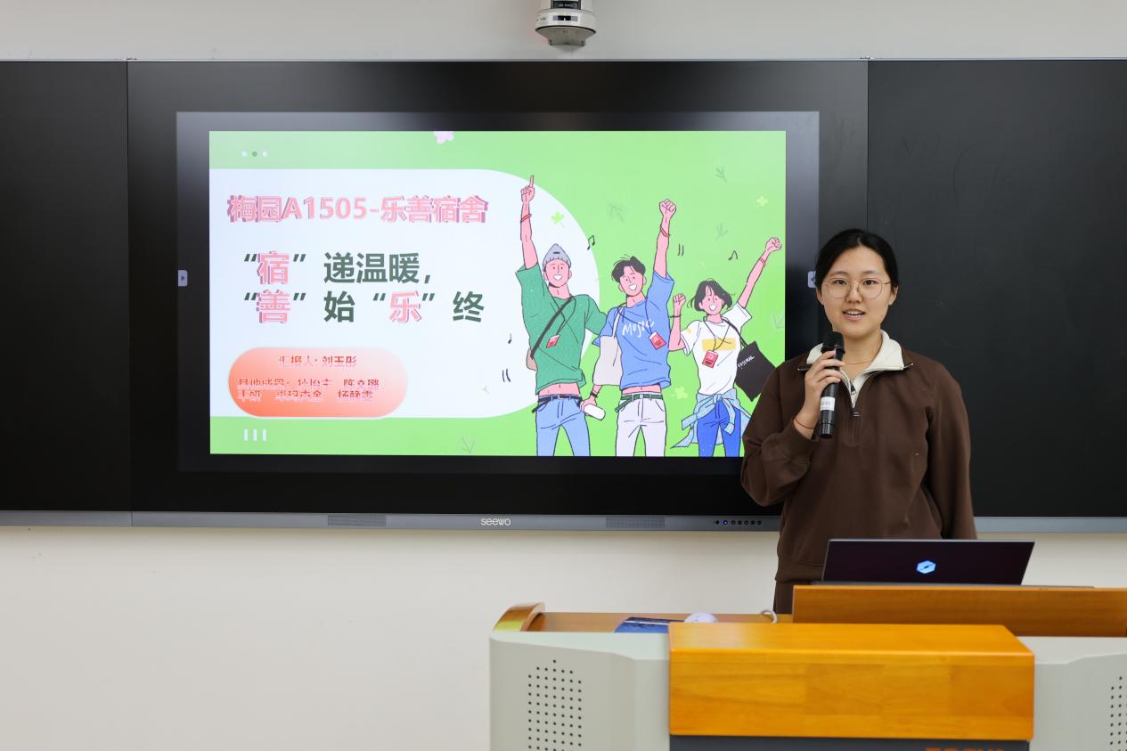 活动现场设置的"宿舍知识竞答"与"默契大考验"等互动环节,有效调动了同学们的参与热情。现场气氛热烈,掌声与欢笑声此起彼伏,将整场活动不断推向高潮。颁奖环节,关工委于云波老师宣读了获奖名单:梅园A1-507、A1-518获评"乐学宿舍";牡丹园927获评"乐业宿舍";梅园A1-505获评"乐善宿舍";曲园G1-103与梅园A1-406获评"乐群宿舍";牡丹园915、1009获评"乐思宿舍";梅园A1-404与牡丹园1013获评"文明宿舍"。她对同学们殷切勉励:“宿舍是你们大学时光里最温暖的港湾,愿你们在这个小小的集体里收获真挚情谊,锤炼优秀品格,让宿舍文化成为人生路上的宝贵财富,在青春赛道上奋力奔跑!”