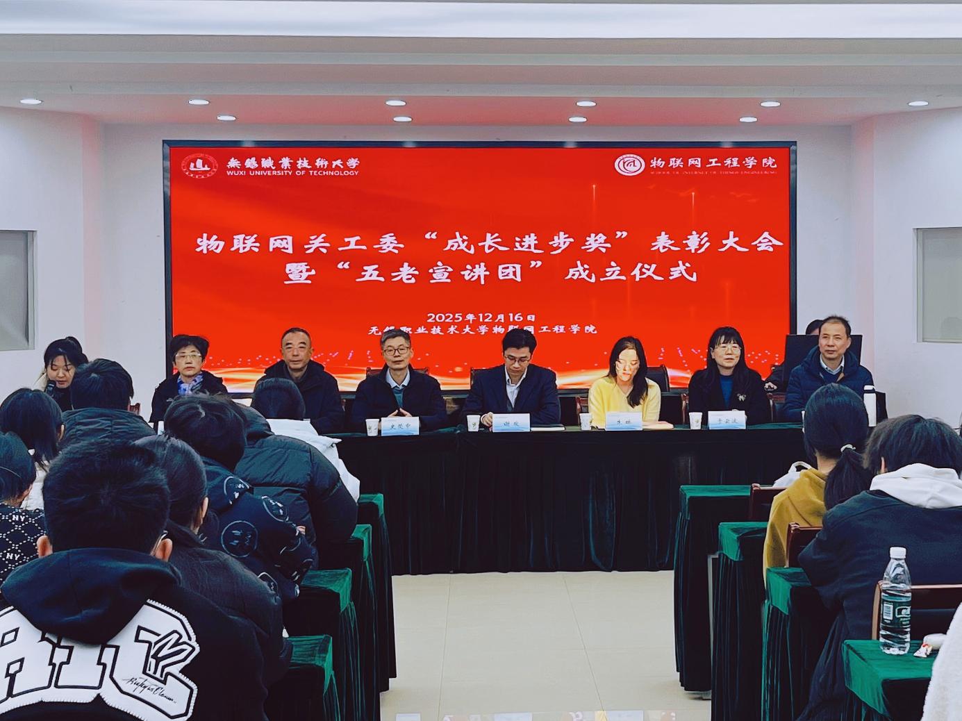 12月16日下午,物联网工程学院关工委2025年度“成长进步奖”表彰大会暨“五老宣讲团”成立仪式在图C401报告厅隆重举行。学院党总支书记谢欢、党总支副书记朱琳,关工委老同志史荧中、于云波、陶惠良、杜伟略、黄越出席活动。获奖学生及各班级学生代表共同参会,一起见证荣誉时刻,开启育人新篇章。