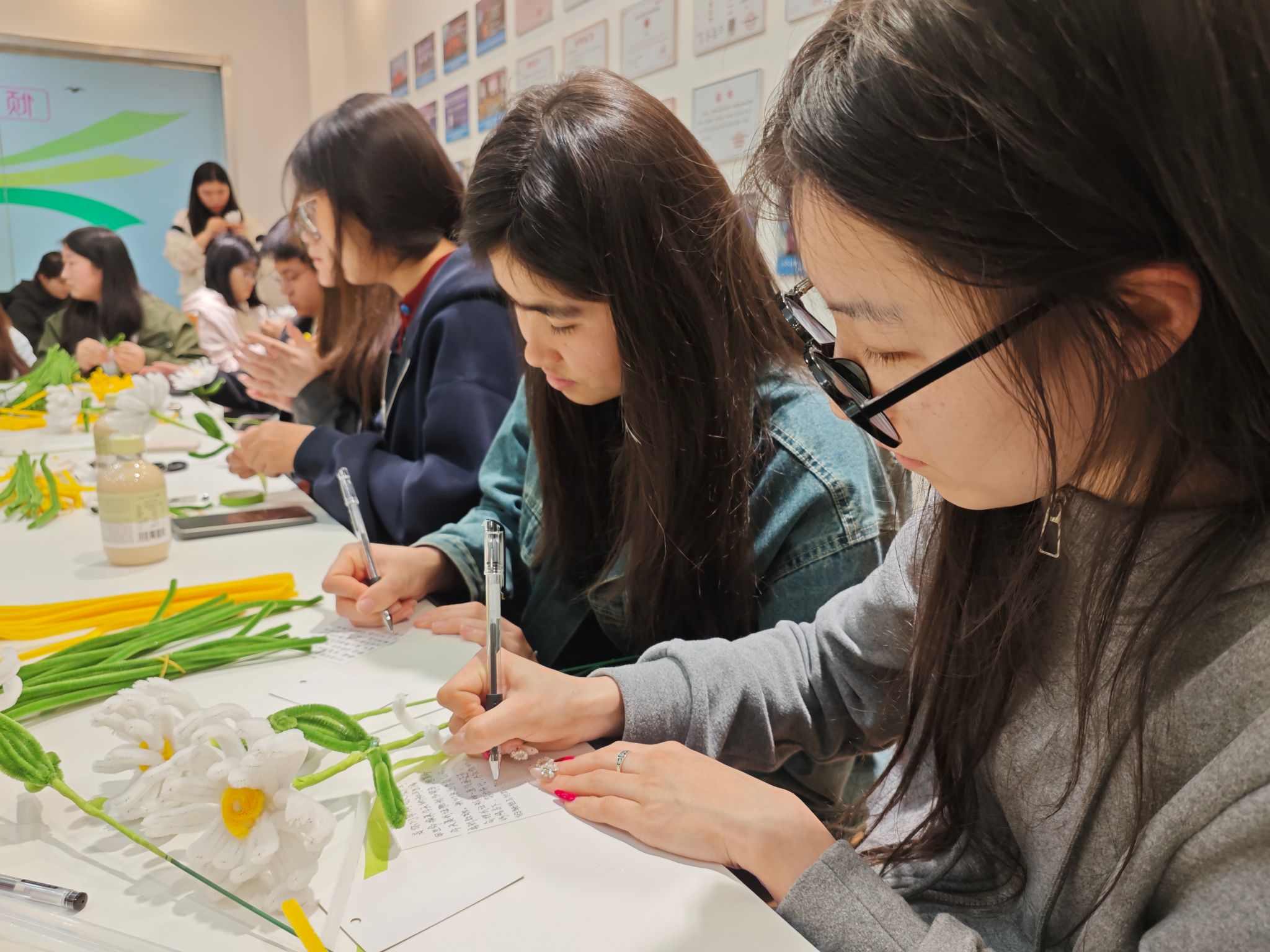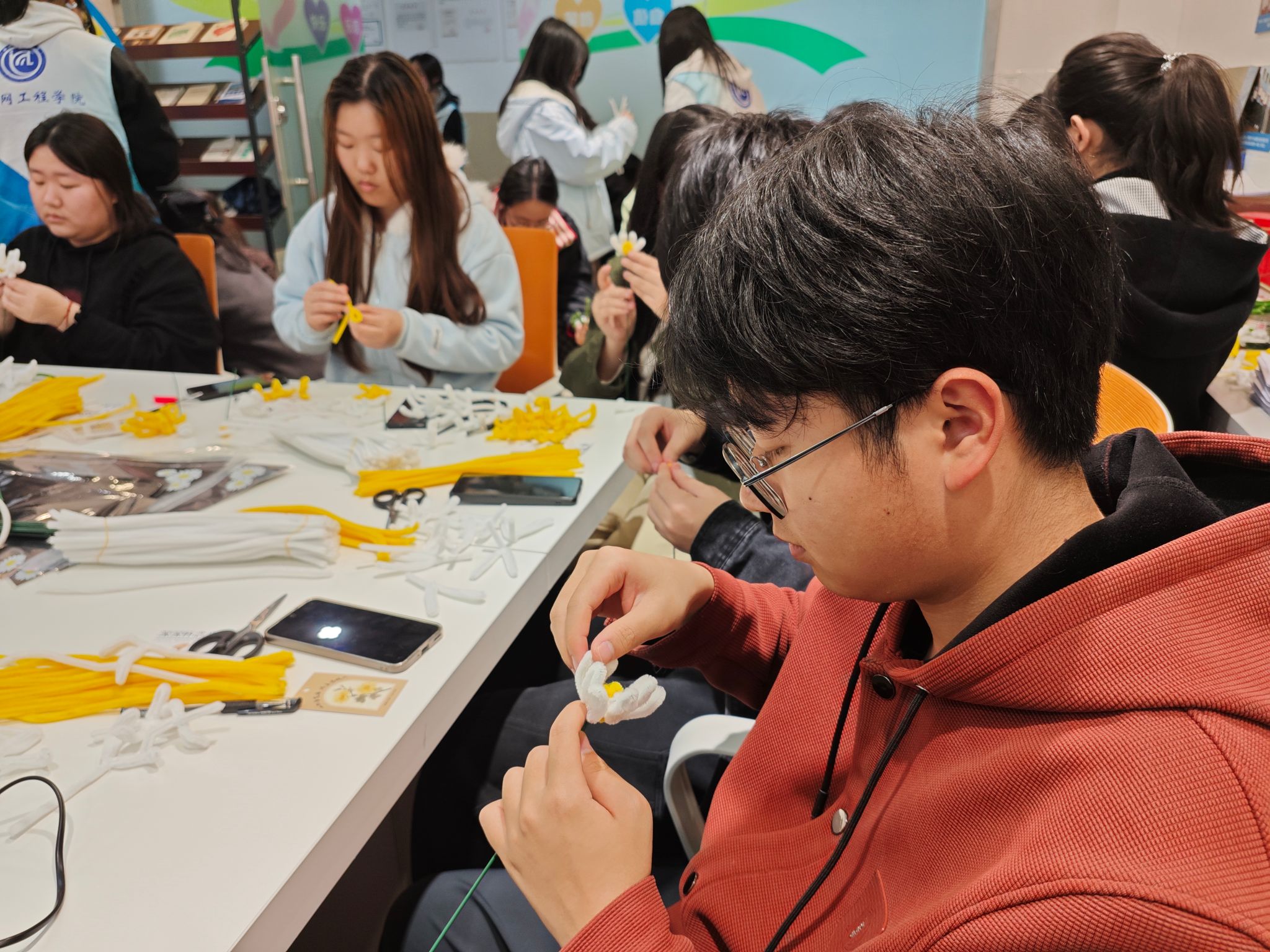活动在庄严肃穆的氛围中拉开序幕。主持人深情讲述了长征路上革命先辈浴血奋战的英雄事迹,带领在场师生重回那段烽火连天的峥嵘岁月。在随后的手工实践环节,同学们在指导下用扭扭棒精心制作菊花花束。金黄与雪白的扭扭棒在指尖缠绕、塑形,一朵朵寄托着无限哀思与崇高敬意的菊花悄然绽放。同学们还在卡片上认真写下对烈士的深情寄语,字里行间流露出对英雄的崇敬之情和将个人理想融入国家发展的坚定信念。
