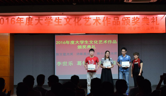 为了丰富大学生业余文化艺术生活,提高当代大学生艺术创作的积极性,2016年06月16日下午16:00,由校团委主办、汽车与交通学院分团委和校学生会宣传部共同承办,在青春剧场隆重举行“五四艺术文化作品”颁奖典礼。此次活动出席的嘉宾有艺术与设计学院副院长承剑芬教授,学校团委书记谢欢老师,副书记赵健老师,党委宣传部新闻中心主任魏艳老师,汽车与交通学院分团委经卫国老师。本次典礼由我院孙园满和毛雪两位同学主持。