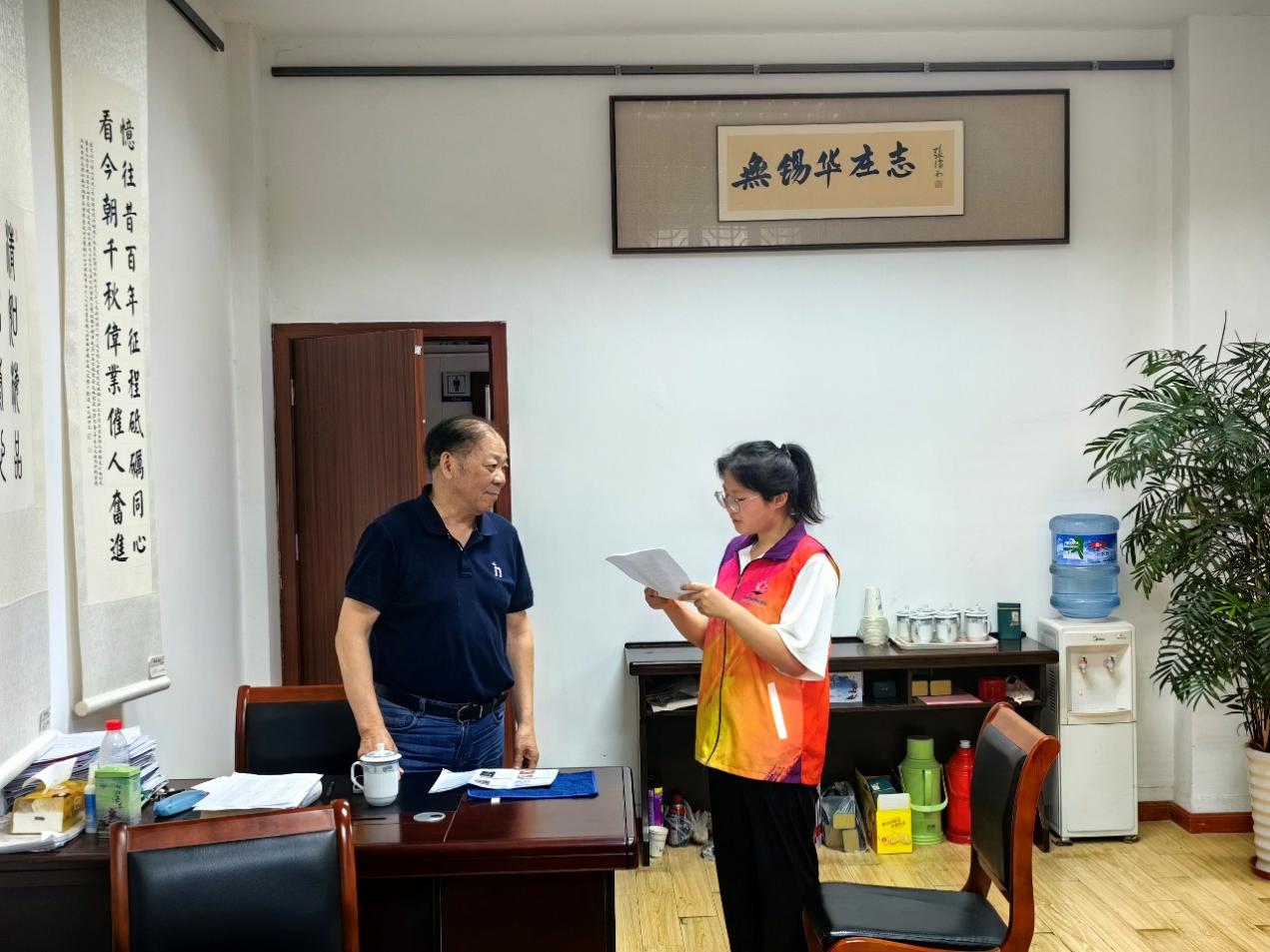 实践团成员与编纂无锡华庄志的老同志进行交流
